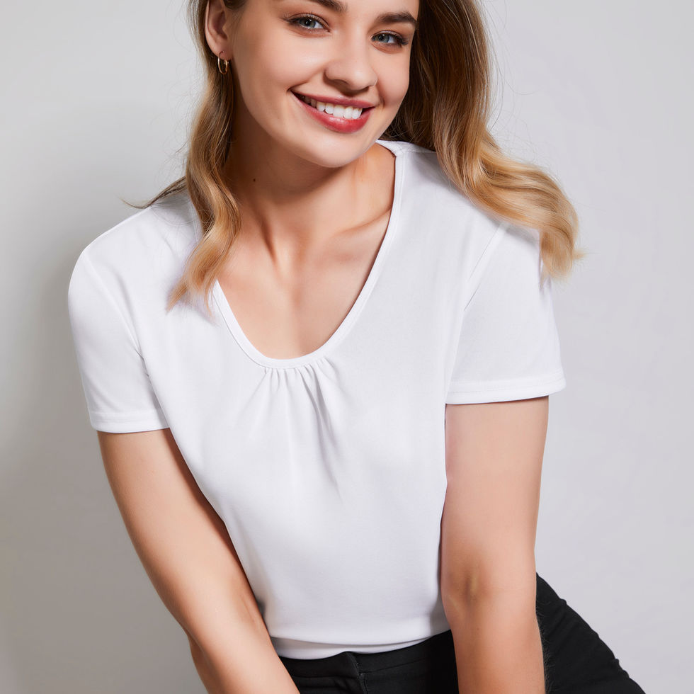 Versatile, t-shirt style with soft gathers at neckline. Perfect on its own or layered under jackets.